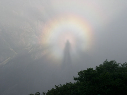 由于牯牛降獨特的地理及氣候條件,極易形成佛光,牯牛佛光清晰規(guī)整,顯現(xiàn)次數(shù)多,時間長。每當雨過天晴,云霧匯聚之時,陽光穿云透霧,灑向山谷,云海上常會懸起一輪五彩光環(huán),光芒四射,艷如花盤,繽紛柔和,仿佛一臺緩緩滾動的佛輦,若隱若現(xiàn),妙趣橫生。通過陽光的作用,若游人奔跑跳躍,光環(huán)中的佛影也隨著舉手投足,配合默契,實為奇觀。