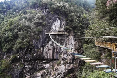 青龍橋位于景區(qū)接待中心服務區(qū)內(nèi),通過檢票口步行5分鐘可以到達,是景區(qū)戶外項目,由長80米、寬0.8米的鋼絲木板橋和長30米、寬1.5米的玻璃棧道組成,高200米,站在青龍橋可俯視整個峽谷,可體驗走鋼絲的感覺,驚險刺激。