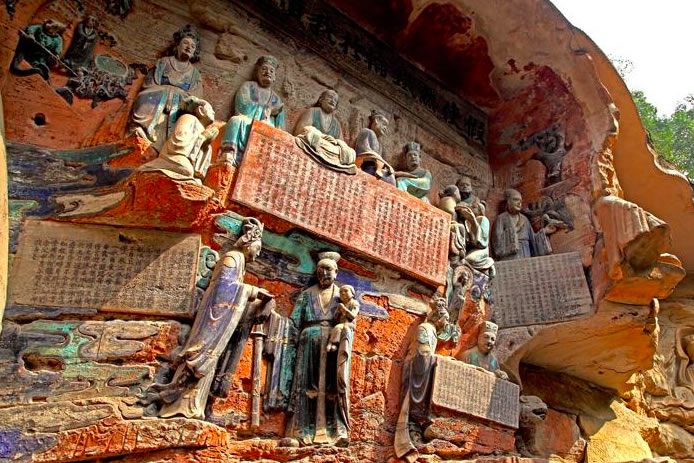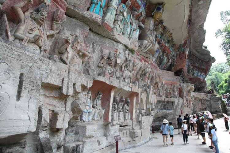 重慶市的大足石刻以其規(guī)模宏大、雕刻精美、題材多樣、內(nèi)涵豐富和保存完整而著稱于世。它集中國佛教、道教、儒家“三教”造像藝術的精華,以鮮明的民族化和生活化特色,成為中國石窟藝術中一顆璀璨的明珠。它以大量的實物形象和文字史料,從不同側(cè)面展示了九世紀末至十三世紀中葉中國石刻藝術的風格和民間宗教信仰的發(fā)展變化,對中國石刻藝術的創(chuàng)新與發(fā)展做出了重要貢獻,具有前代石窟不可替代的歷史、藝術和科學價值。許多歐洲人、尤其是法國人,對大足石刻寵愛倍加。