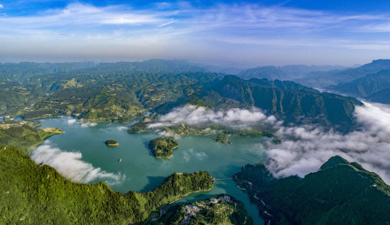 重慶黔江小南海國(guó)家地質(zhì)公園,位于重慶市黔江區(qū)小南海鎮(zhèn)南海村,重慶與湖北交界處,距黔江城北部30余千米。是一個(gè)融山、海、島、峽諸風(fēng)光于一體的高山淡水湮(堰)塞湖泊,也是中國(guó)國(guó)內(nèi)迄今保存最完整的一處古地震遺址。