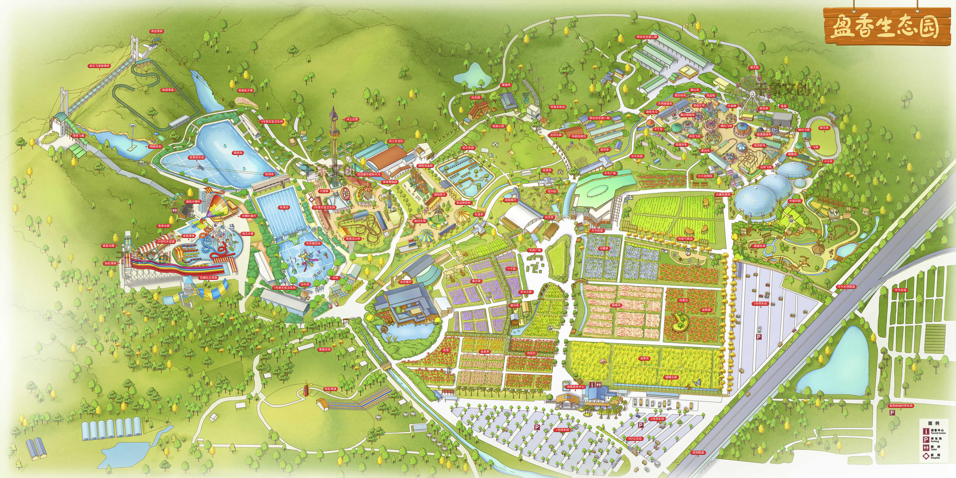 水上樂園、四季花海、科普王國、尖叫歡樂世界、反斗水城、牛牛劇場、凌云飛渡玻璃橋、開心牧場、抖樂園、彩虹滑道