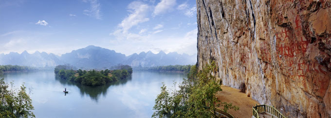 位于縣城西北25千米的明河畔,以其古老神奇的巖畫而聞名中外;ㄉ綆r畫是左江流域巖畫中的代表,也是世界同類巖畫中單位面積最大、畫面最集中、內(nèi)容最豐富、保存最完好的一處巖畫,被譽(yù)為是壯族文化的瑰寶。 1988年,花山巖畫被國務(wù)院列為全國重點(diǎn)文物保護(hù)單位。1998年,以花山巖畫為中心的花山風(fēng)景區(qū)被定為國家級風(fēng)景旅游名勝區(qū),成為與桂林漓江、桂平西山齊名的廣西三大國家級風(fēng)景旅游名勝區(qū)之一。2000年開始,國家文物局實施花山巖畫保護(hù)計劃,對保護(hù)巖畫進(jìn)行深入研究。2003年6月,寧明縣啟動花山巖畫申遺工作。2004年11月,國家建設(shè)部把寧明縣花山巖畫列入《中國申報世界遺產(chǎn)預(yù)備名單》。