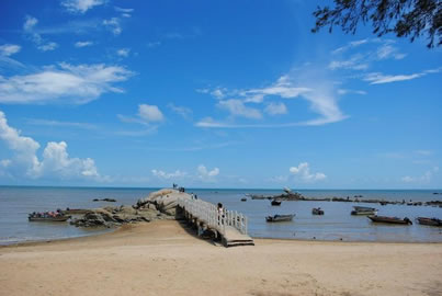 三娘灣沿岸月亮沙灘長(zhǎng)約1.5公里,掩映在欏麻防風(fēng)林中的海灘呈金黃色,松軟細(xì)膩;緊傍三娘灣的漁村里雞鳴犬吠,炊煙裊裊,讓人領(lǐng)略到與都市旅游迥然不同的野趣。