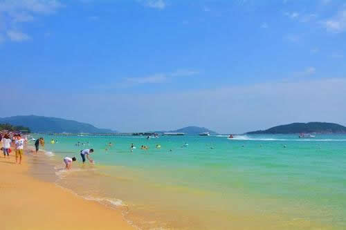 亞龍灣為一個(gè)月牙灣,擁有7千米長的銀白色海灘,沙質(zhì)相當(dāng)細(xì)膩。而這里的南海沒有受到污染,海水潔凈透明,遠(yuǎn)望呈現(xiàn)幾種不同的藍(lán)色,而水面下珊瑚種類豐富,可清楚觀賞珊瑚,適合多種水面下活動包括潛水等,令海底成為了當(dāng)?shù)氐穆糜蔚暮诵摹0渡狭帜居粲羰[蔥。冬季這里的氣溫27攝氏度,水溫20攝氏度,是一處理想的冬季避寒和休閑度假勝地。號稱“東方夏威夷”。沿海岸一帶布滿多座高級酒店,包括國際五星級的假日酒店。
