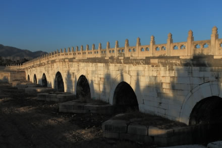 拱形橋在石橋中是等級(jí)最高的一種。七孔拱橋在清東陵只孝陵有一座。橋長110米,兩側(cè)安設(shè)石欄板126塊,石望柱128根,抱鼓石4塊。