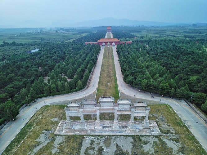 入關(guān)第一帝世祖順治皇帝的孝陵位于南起金星山,北達(dá)昌瑞山主峰的中軸線上,其余皇帝陵寢則以孝陵為中軸線按照“居中為尊”、“長幼有序”、“尊卑有別”的傳統(tǒng)觀念依山勢在孝陵的兩側(cè)呈扇形東西排列開來。各陵按規(guī)制營建了一系列建筑,總體布局為"前朝后寢"。“百尺為形,千尺為勢”的審美思想貫穿于每一座陵寢建筑中。