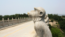 百猴橋,全長(zhǎng)107米,壩高15.2米,為16孔15阻攔水壩式景觀橋,護(hù)欄共有石猴130個(gè),故名百猴橋。