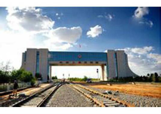 國門莊嚴(yán)肅穆,在國門乳白色的門體上方嵌著“中華人民共和國”七個(gè)鮮紅大字,上面懸掛的國徽閃著的金光,國際鐵路在下面通過。