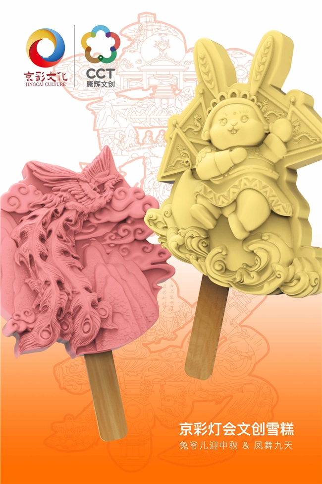 燈會(huì)文創(chuàng)雪糕:造型1兔爺迎中秋——體現(xiàn)北京特色的非遺兔爺,配合京劇裝扮;造型2選自“鳳舞九天”燈組。