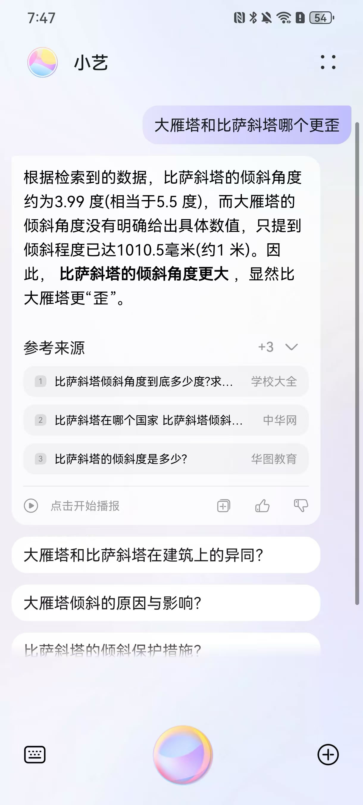 確定好目的地之后,到底怎么玩?對大多數(shù)人來說,既要規(guī)劃詳細、又要細節(jié)不出紕漏的“完美旅行攻略”非常費時費力。而小藝可以從特色景點、住宿、餐飲、注意事項等多個維度出發(fā),結合用戶確定的旅行目的地,為你解答各種旅行知識,堪稱旅行界的百科全書。用戶只需長按華為手機電源鍵或者對手機說“小藝小藝”即可喚醒小藝,不論是詢問當?shù)氐娜宋闹R、歷史典故,還是推薦熱門景點、美食小吃,小藝都能對答如流,幫助大家更快速了解目的地的相關信息。比如你可以直接問它“為什么景德鎮(zhèn)的瓷器很出名”、大雁塔和比薩斜塔哪個更歪” “為什么很多人喝不慣北京豆汁兒”,通過各種問題逐漸了解到目的地的各種信息,幫助提升旅行體驗。