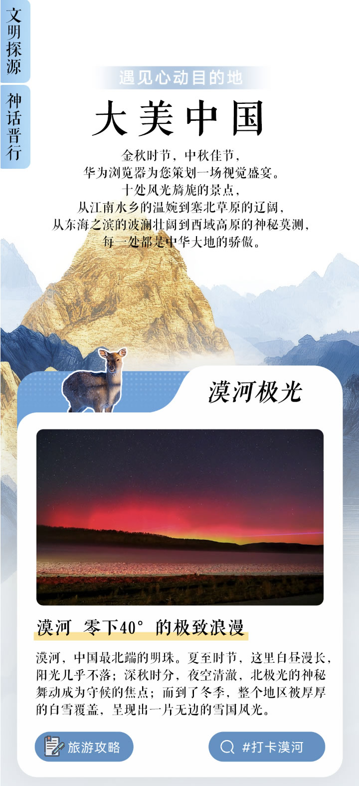 “大美中國”可以說給熱愛自然風(fēng)光的愛好者帶來了視覺盛宴。里面精選了十處極具代表性的中華美景,從溫婉細(xì)膩的江南水鄉(xiāng)到遼闊壯麗的塞北草原,從波瀾壯闊的東海之濱到神秘莫測的西域高原,每一處都是對中華大地絕美風(fēng)光的極致詮釋。其中,以漠河“零下40°的極致浪漫”為例,無論是夏日的長晝、深秋的北極光,還是冬日的雪國風(fēng)光,都讓人心生向往。用戶不僅可以在專題頁中詳細(xì)了解每一處景點(diǎn)的獨(dú)特魅力,還能一鍵直達(dá)詳細(xì)旅游攻略,包括大興安嶺自駕環(huán)線等周邊推薦,輕松規(guī)劃出完美的國慶出游計(jì)劃。