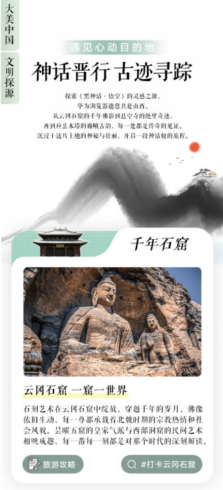 前段時間大熱的《黑神話·悟空》也讓山西古建進(jìn)入大眾視野,不少游客希望在十一跟隨悟空的步伐,探索打卡這些著名景點(diǎn)。在“神話晉行”板塊可以發(fā)現(xiàn),從云岡石窟的千年佛影到懸空寺的絕壁奇跡,再到應(yīng)縣木塔的巍峨古韻,每一處景點(diǎn)都承載著深厚的歷史文化底蘊(yùn)和傳奇色彩。專題頁面中這些景點(diǎn)的詳細(xì)信息,包括視頻、圖片、筆記、資訊等多媒體內(nèi)容,以及詳盡的旅游攻略,為一場說走就走的神話之旅做好充分準(zhǔn)備。