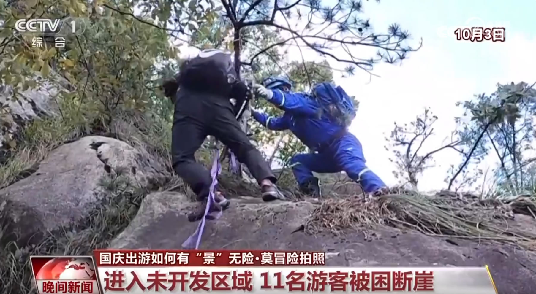 10月2日傍晚,有11名外地游客在安徽績(jī)溪縣一座未開(kāi)發(fā)的山上攀爬時(shí),因?yàn)槊月穼?dǎo)致被困,當(dāng)?shù)毓埠兔耖g救援隊(duì)立即展開(kāi)聯(lián)合救援。在3日凌晨一點(diǎn)多,救援人員找到了被困游客,由于游客被困的地方是未開(kāi)發(fā)的區(qū)域,山勢(shì)十分陡峭,且有多處斷崖,救援人員只能反復(fù)利用繩索,將被困游客挨個(gè)兒送至安全地帶。