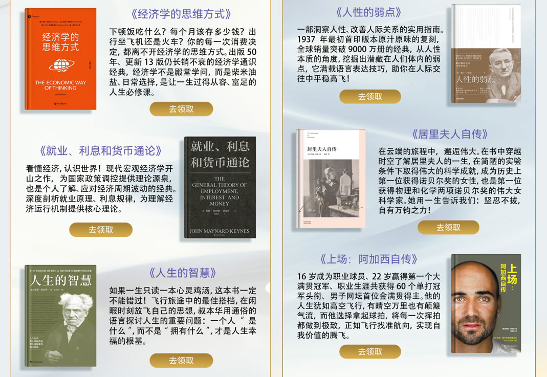 華為閱讀與國航共同精選了適合旅途閱讀的“國航伴讀書單”,包括《經(jīng)濟(jì)學(xué)的思維方式》、《就業(yè)、利息和貨幣通論》、《人生的智慧》、《人性的弱點(diǎn)》、《居里夫人自傳》、《上場:阿加西自傳》等好評付費(fèi)書籍,并提供給國航用戶免費(fèi)閱讀,為乘客的飛行時(shí)光帶來更多精神享受。