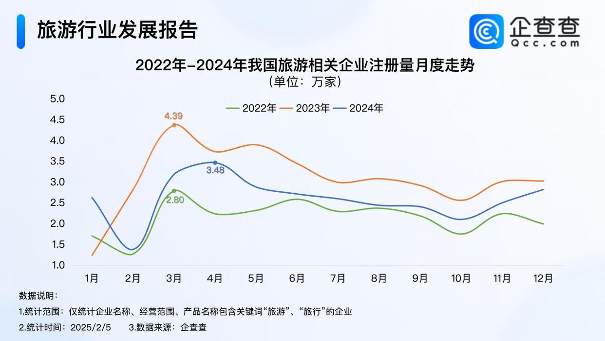 企查查數(shù)據(jù)顯示,2024年,我國累計(jì)注冊31.3萬家旅游相關(guān)企業(yè),分月份來看,4月相關(guān)企業(yè)注冊量達(dá)3.48萬家,是全年注冊量最高月份;從2022年至2024年我國旅游相關(guān)企業(yè)注冊量月度分布來看,每年的3月、4月是旅游相關(guān)企業(yè)注冊高峰期。