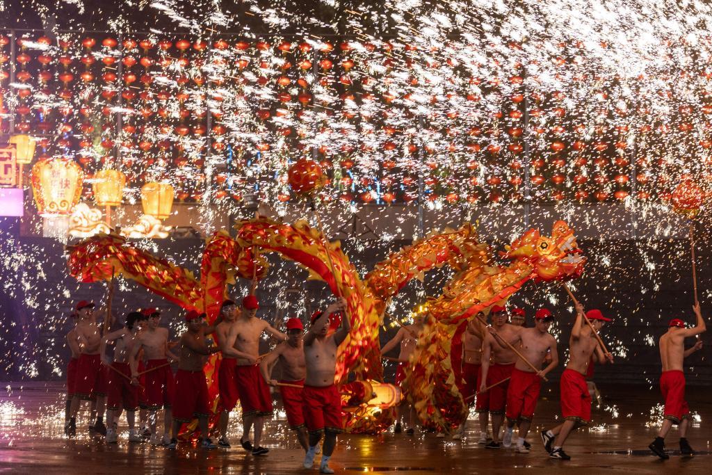 重慶市銅梁區(qū)奇彩夢園景區(qū)的火龍表演。新華社記者黃偉 攝