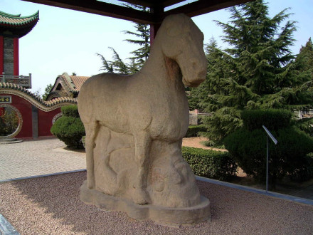 1981年5月在平陽(yáng)公主墓南,西吳鄉(xiāng)竇馬村農(nóng)民在平整土地時(shí)發(fā)現(xiàn)這件文物。高62厘米,長(zhǎng)76厘米,通體銅鑄鎏金,昂首,翹尾,四腿直立,體態(tài)矯健。頭部造型甚為生動(dòng),粉鼻亮眼,兩耳豎立。史書記載其為“金馬”,系以西漢時(shí)大宛國(guó)的汗血馬為原型而精制的工藝品。這件國(guó)寶,現(xiàn)收藏在茂陵博物館。