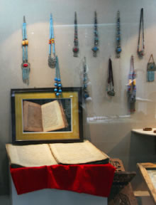 館中展出了在刀郎地區(qū)收集到的部分古老器物、錢幣、文牘、書籍,讓見證了物質的刀郎;刀郎人古時勞作生活的塑像、古老的居室、用具、物品,則使通過時間的隧道,回到了古老的時代,與昔日的刀郎人對話。