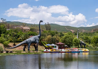 由“侏羅紀(jì)大瀑布”、“群龍對峙”、“腕龍相親”、“氣龍追逐”、“雙龍飲瀑”、“霸王龍窺獵”、“侏羅紀(jì)叢林”、“海棗之王”、“沙漠之林”等九大景觀真實再現(xiàn)了侏羅紀(jì)時代恐龍王國的生活場景,構(gòu)造出一個1億年前生氣勃勃、繁榮昌盛的侏羅紀(jì)世界,讓游客飽享一頓視覺大餐。
