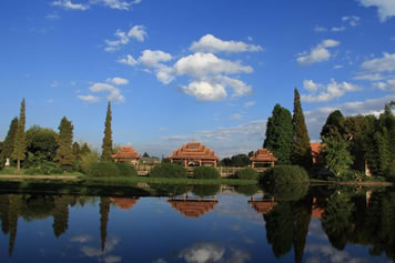 傣族寨是進(jìn)入民族村的第一個村寨,占地面積27畝,三面環(huán)水,綠樹掩映。一幢幢“干欄式”傣家竹樓,通過蜿延的紅砂石小徑聯(lián)向肅穆的緬寺。巍峨壯觀的白塔,精巧玲瓏的風(fēng)雨橋,以及風(fēng)雨亭、水井、鐘亭等建筑充滿著傣家的濃郁風(fēng)情,是傣寨真實的民間景觀再現(xiàn) 。