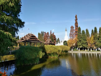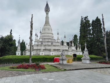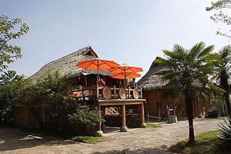 德昂村建筑納入了能容納數(shù)十人居住的德昂大房子,氈帽頂?shù)男》孔,還有頗具浪漫色彩的大公房、小公房……還建有“龍陽塔”標(biāo)志及佛教奘房、佛塔。