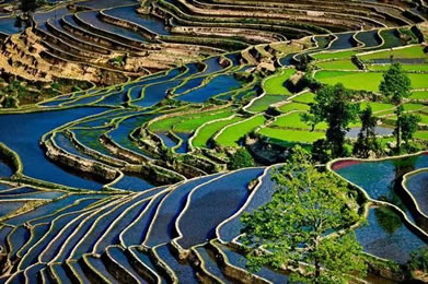 元陽(yáng)梯田,位于云南省紅河州元陽(yáng)縣的哀牢山南部,是哈尼族人世世代代留下的杰作。元陽(yáng)梯田是紅河哈尼梯田的核心區(qū)。紅河哈尼梯田是以哈尼族為主的各族人民利用特殊地理氣候同墾共創(chuàng)的梯田農(nóng)耕文明奇觀,規(guī)模宏大,氣勢(shì)磅礴。元陽(yáng)哈尼族開(kāi)墾的梯田隨山勢(shì)地形變化,坡緩地大則開(kāi)墾大田,坡陡地小則開(kāi)墾小田,甚至溝邊坎下石隙也開(kāi)田,因而梯田大者有數(shù)畝,小者僅有簸箕大,往往一坡就有成千上萬(wàn)畝。