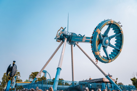 天旋地轉(zhuǎn),陀螺儀類型游樂設(shè)施,高度16米,同時(shí)乘坐26人。當(dāng)轉(zhuǎn)臂與搖臂的轉(zhuǎn)速、旋轉(zhuǎn)方向在連續(xù)變化時(shí),座椅以前后、上下、左右不同方向旋轉(zhuǎn)不斷變換狀態(tài),搖擺、顛簸、翻滾……使乘客如置身于太空自由翱翔。